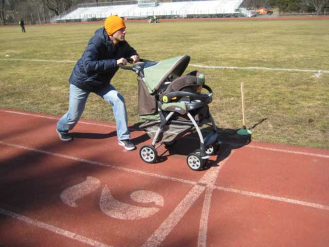 Original plans were to have a 4X400M relay using 4 carriages (must have matching colors and wheels) and pushers, using a 40M exchange zone to switch the baby from carriage to carriage. Taylor nixed the idea with a terse, “Nobody pushes my daughter around!”