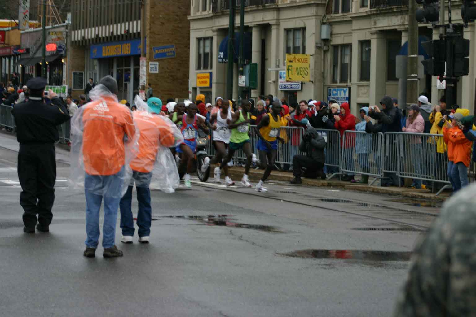 | It has always been my M.O. to pick one spot to watch the race. Usually it is BC, one year the firehouse, once at Fairbanks in Brookline and even once standing at the finish line handing out medals. This year I figured I'd try to hit a few spots by bike (I even bought a new one for the occasion) but the weather dampened my enthusiasm. I ended up joining with Arlene and Emily to do a "car chase" of the leaders. Em mapped out a plan with predicted times that were made a little easier when the race went out slower than usual. We caught them at 10K, 20K, a close miss near the fire station and a make at Cleveland Circle, then hopped on the T to catch the after race festivities. |