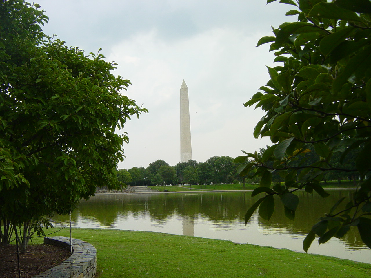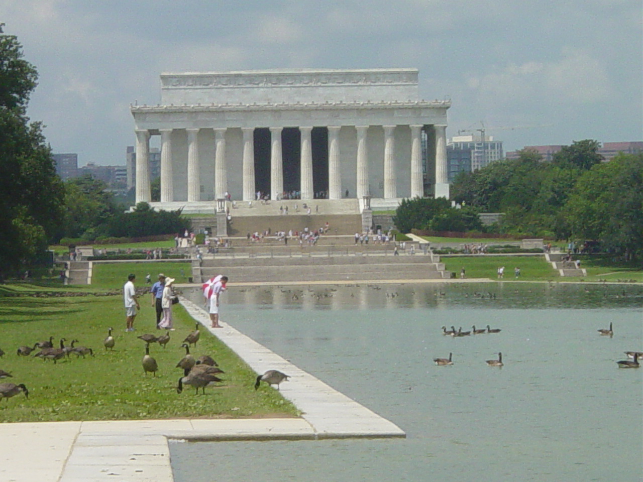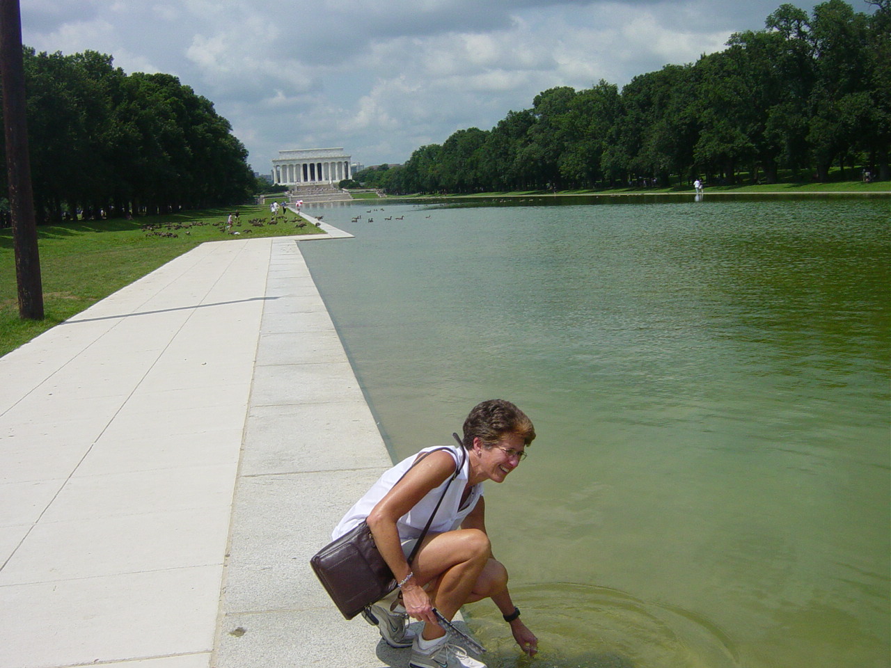 | Arlene checks out the reflecting pool. That is the Lincoln Memorial in the background. |