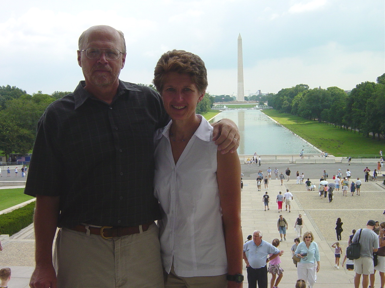 | We are on the steps of the Lincoln Memorial, behind us lies the reflecting pool and Washington Monument |