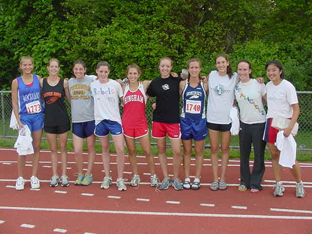 Some of the top finishers from the Hockomock included : Amanda Walkins of North Attleboro (17th-4th from rt.), Jenny Pearce of Sharon (11th-far left), and Courtney Lincoln of Mansfield (20th-5th from left) |